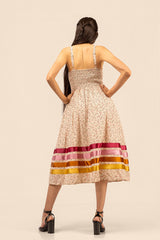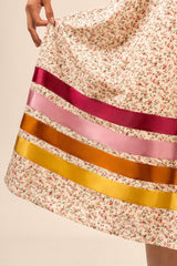 A corset bodice tops a charming fit-and-flare skirt, crafted from soft vintage inspired ditsy cotton with ribbon accents.