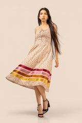 A corset bodice tops a charming fit-and-flare skirt, crafted from soft vintage inspired ditsy cotton with ribbon accents.