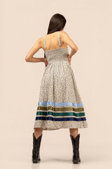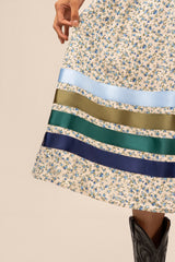 A corset bodice tops a charming fit-and-flare dress, crafted from soft vintage inspired ditsy cotton with ribbon accents on the skirt.