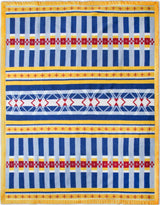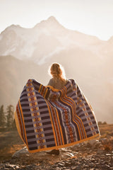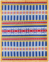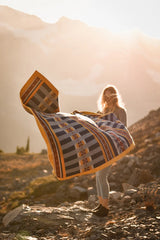 The designs of the All My Relations Wool Blanket honor and recognize the proud nations that Bethany comes from. Cross-lain vertical stripes and crosses speak to Crow design elements, while horizontal stripes and the Morning Star pattern reflect her Northern Cheyenne heritage. Traditionally, the two tribes were enemies with a longstanding rivalry dating back to the days when they lived freely and buffalo roamed the Great Plains. This design weaves the differences and blends the similarities of each tribal nation in a harmonious symbol of unity.