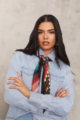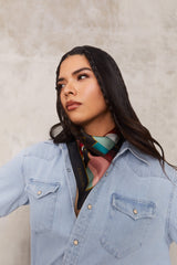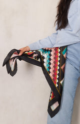 Inspired by the rich colors and bold geometry of the Art Deco era, this silk scarf features decadent details and Indigenous motifs created with original artwork by Bethany Yellowtail.